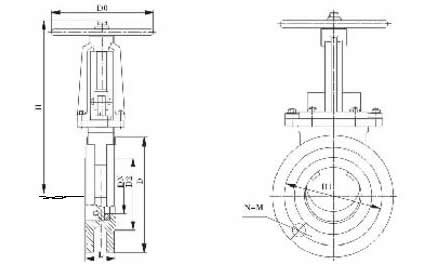 Seven, PZ73 series manual knife type slurry valve, manual knife gate valve, manual mortar knife gate valve, cinder manual knife gate valve Structure diagram and the main external and connecting dimensions manual knife type gate valve (mm):